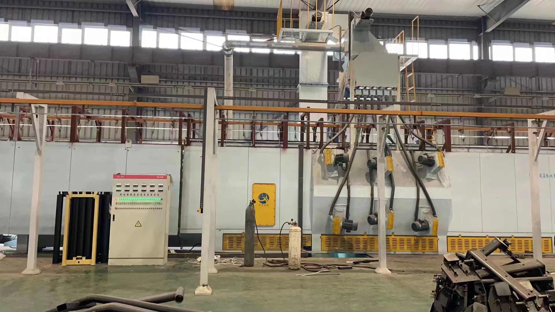 連續(xù)式是將工件懸掛在吊鏈鉤上,勻速連續(xù)循環(huán)地通過拋丸室,進(jìn)入清理室后,在自轉(zhuǎn)機(jī)構(gòu)的驅(qū)動(dòng)下工件一邊自轉(zhuǎn),一邊前