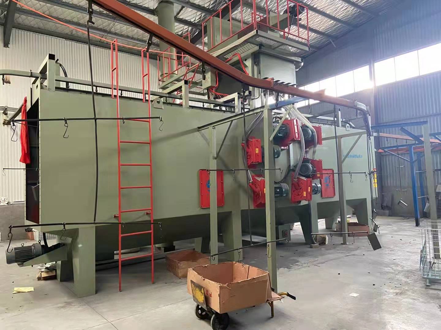 連續(xù)式是將工件懸掛在吊鏈鉤上,勻速連續(xù)循環(huán)地通過拋丸室,進入清理室后,在自轉(zhuǎn)機構(gòu)的驅(qū)動下工件一邊自轉(zhuǎn),一邊前